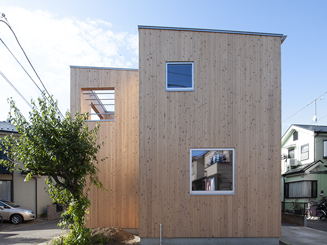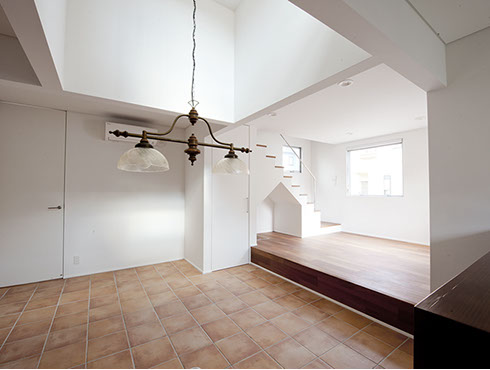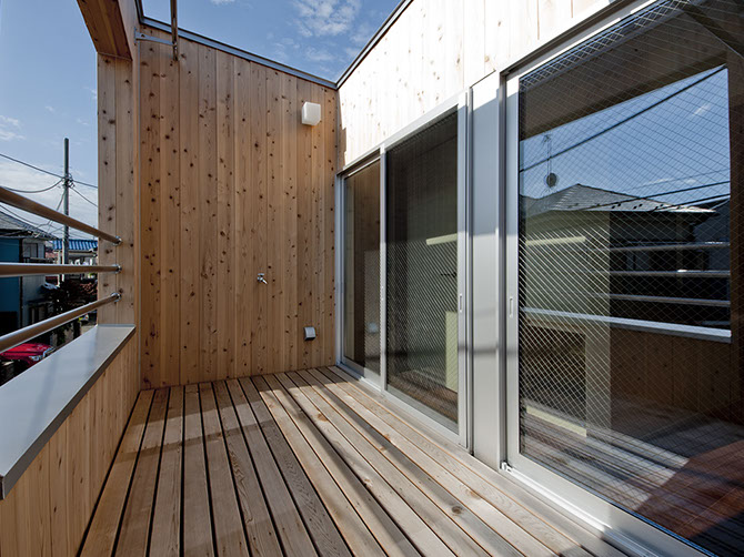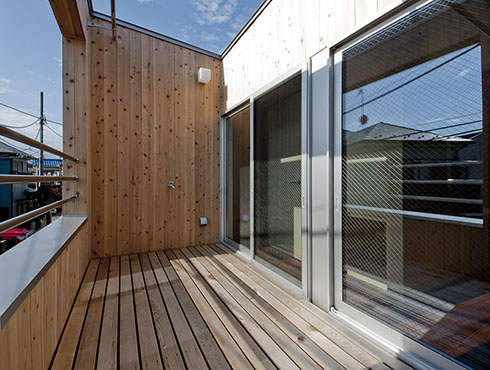 7頭の犬と暮らす夫婦のための建替えプロジェクト。角地で日当たりがよい反面、1階の居室は道路と近くなり、旧宅では日中でもカーテンを閉じがちに。そこで2階のテラスごしの日差しを1階にも取り入れられるように設計しました。犬たちが日なたを求めて自由に家の中を回遊できる住宅です。