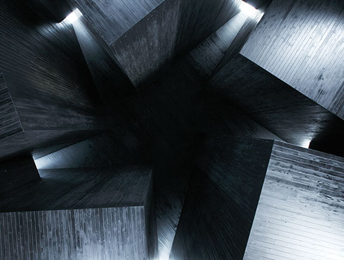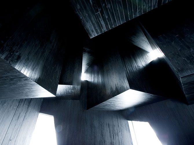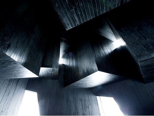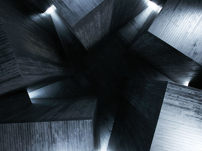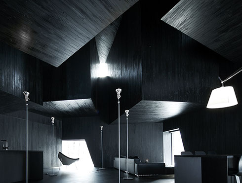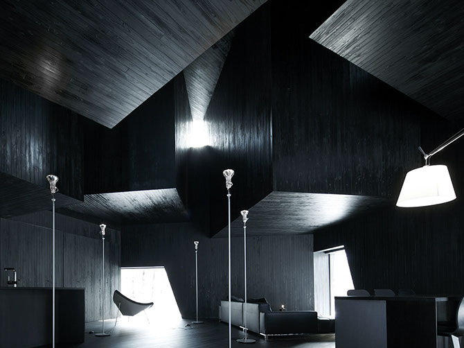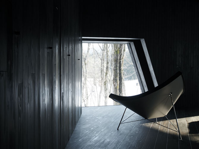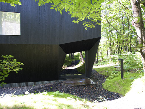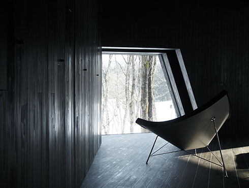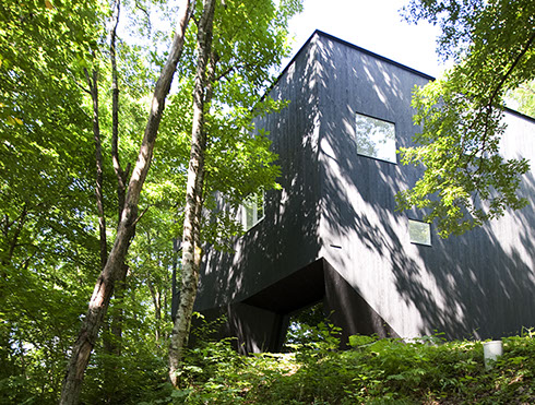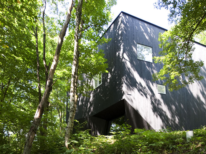 東北の山奥に、日常から抜け出すための場所として建てられた、5つの木箱が浮かぶ別荘。「木箱が浮かぶ漆黒の空間」と、「木箱の中の真っ白な空間」からなるこの建物は、森の中にぽっかりと空いた洞穴に迷い込んだような感覚の中で、非日常を静かに楽しむために用意された特別な空間です。