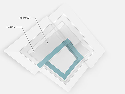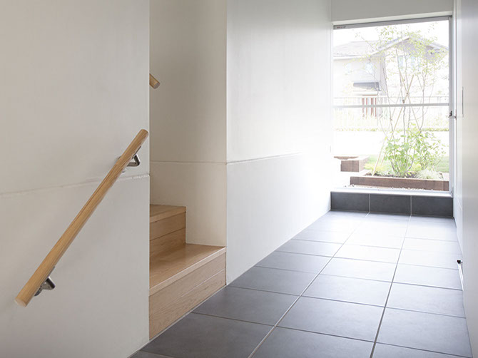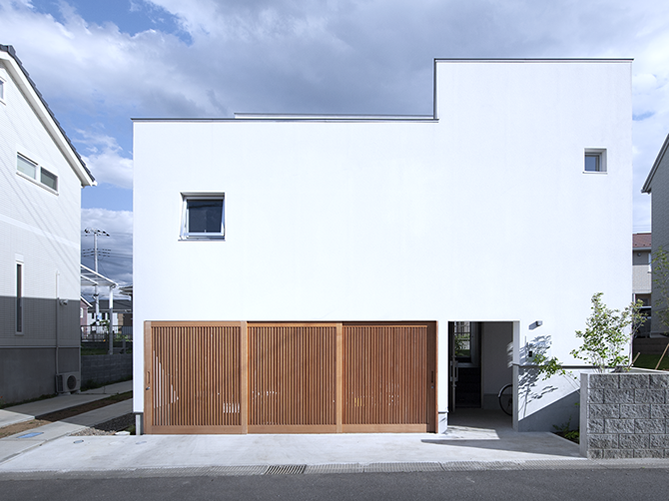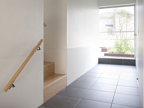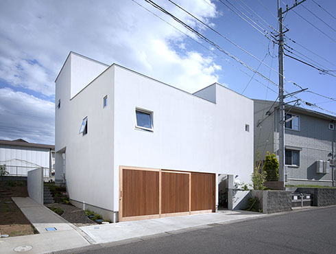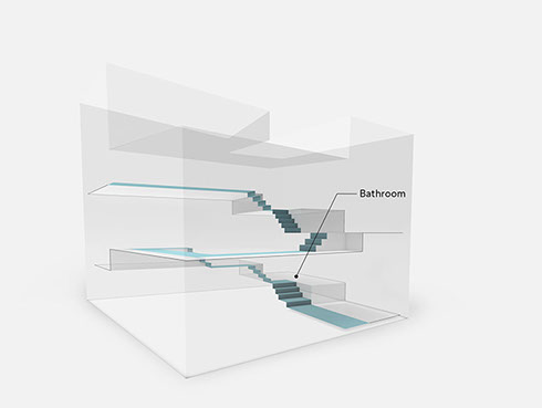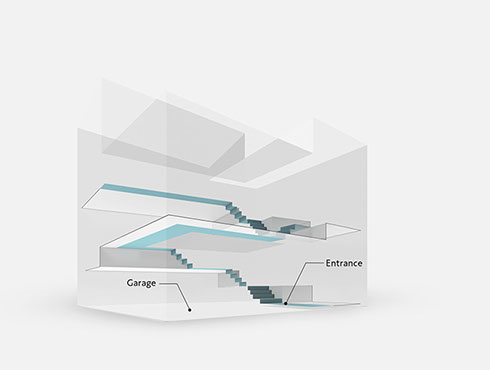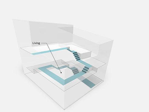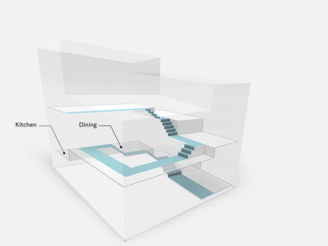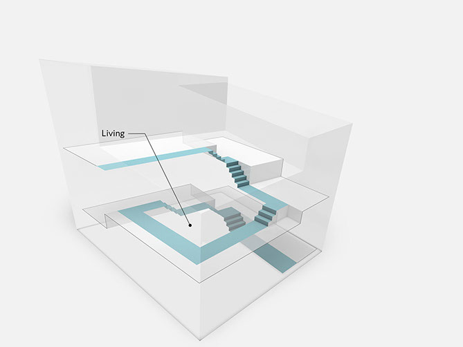 敷地の手前と奥にできる1.2mの高低差をきっかけにした、7段のフロアをもつ住宅。一続きの階段で全ての部屋を緩やかにつなぎました。集合住宅で生まれ育った3人の子供達の「階段のある家が欲しい!」という願いと、「年月を経て、近づいたり離れたりしながらも、家族の関係性を保ち続けたい」という両親の思いを、7段のフロアをつなぐ1本の階段で表現しました。