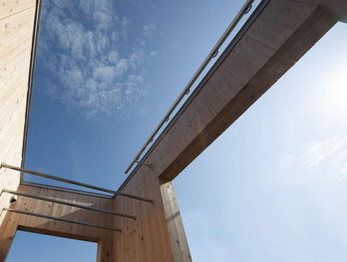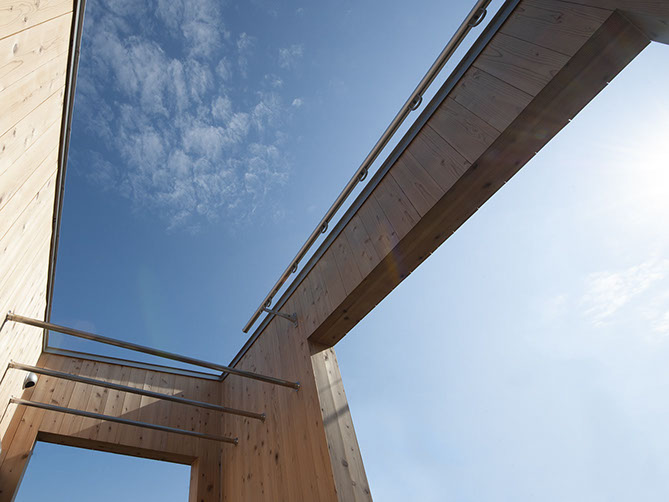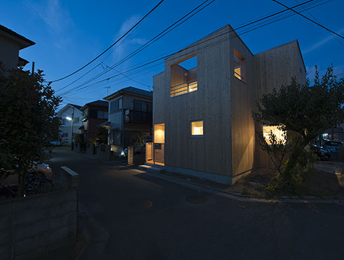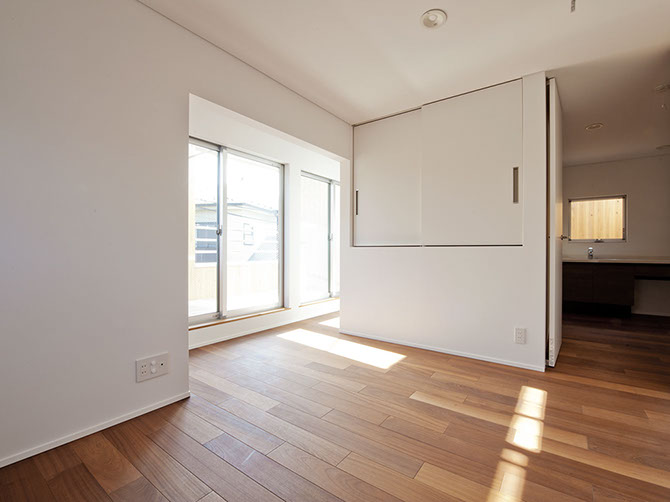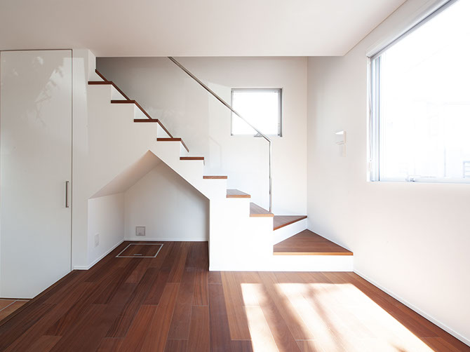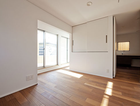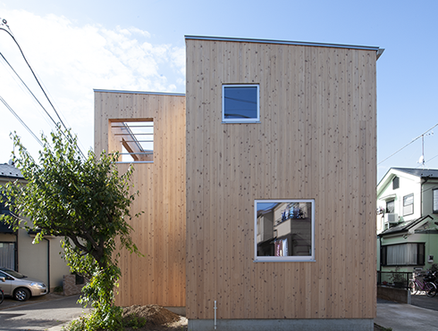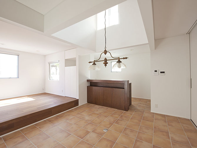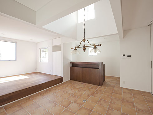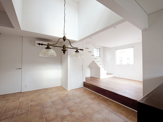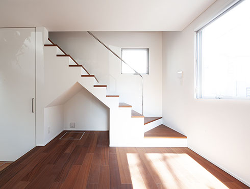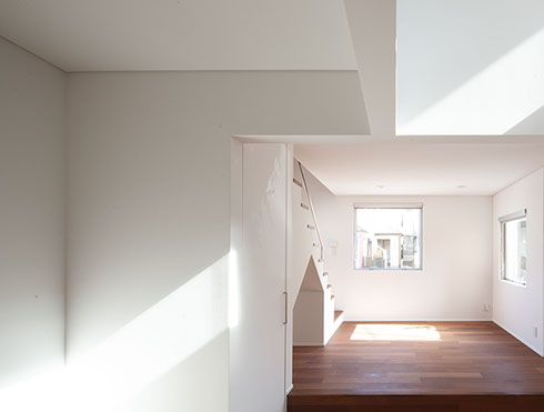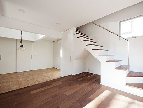7頭の犬と暮らす夫婦のための建替えプロジェクト。角地で日当たりがよい反面、1階の居室は道路と近くなり、旧宅では日中でもカーテンを閉じがちに。そこで2階のテラスごしの日差しを1階にも取り入れられるように設計しました。犬たちが日なたを求めて自由に家の中を回遊できる住宅です。
