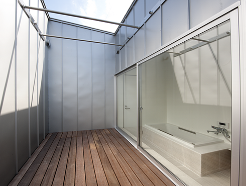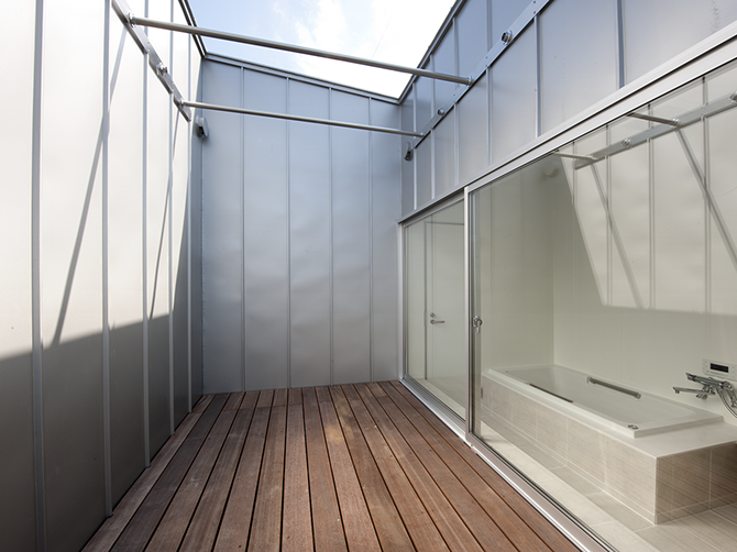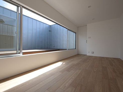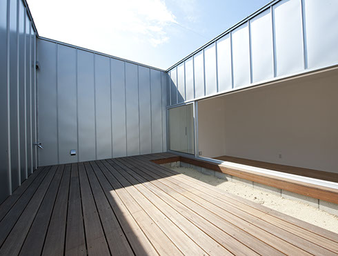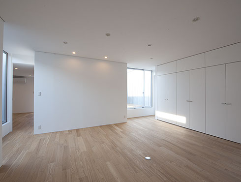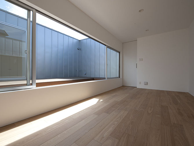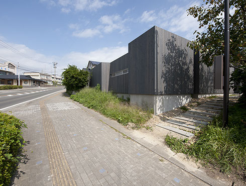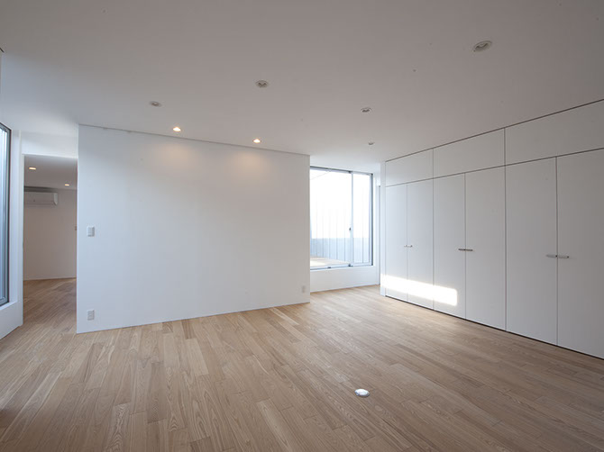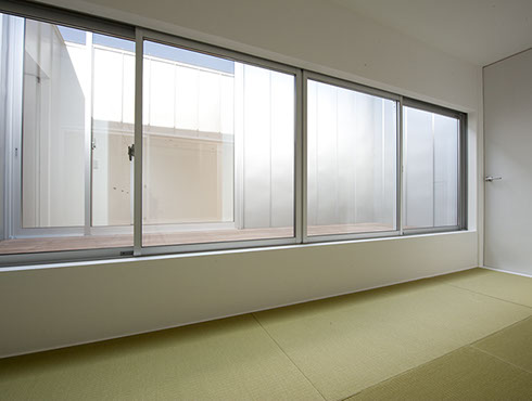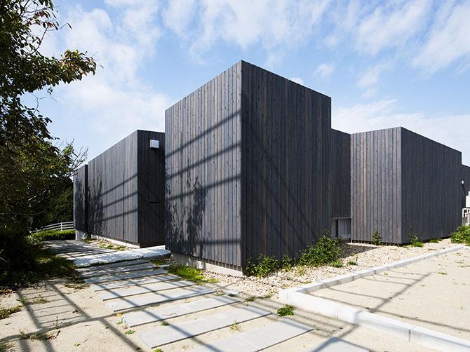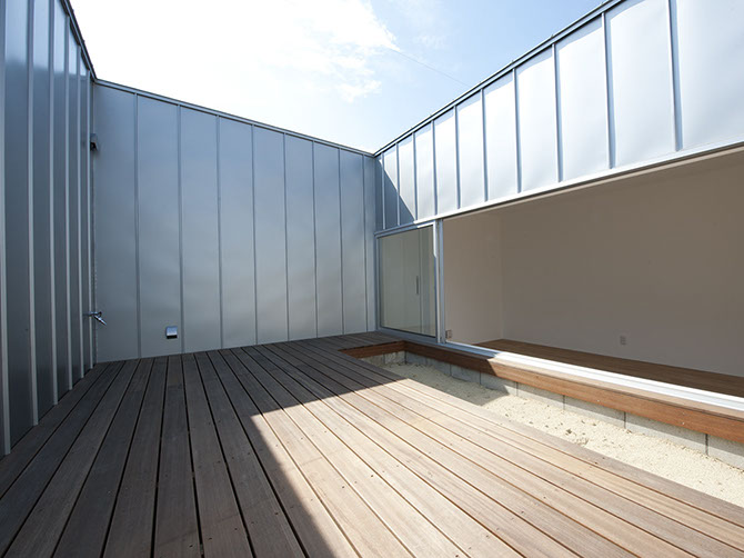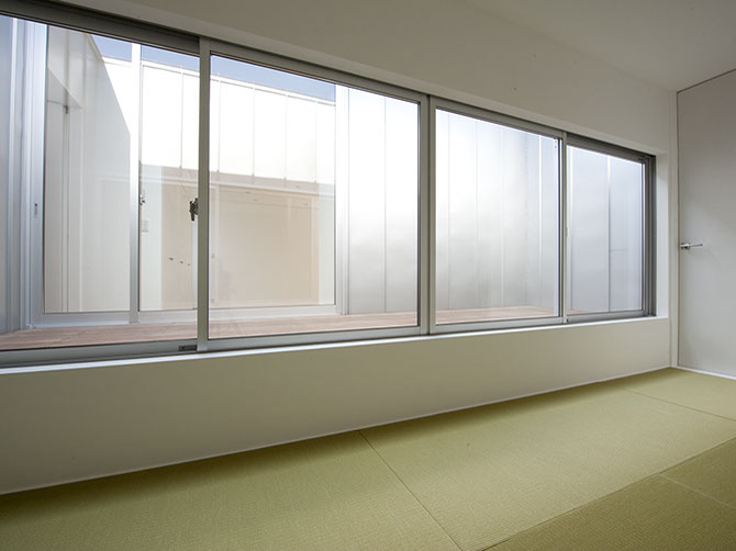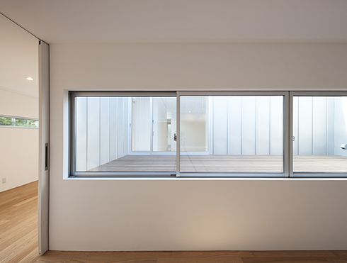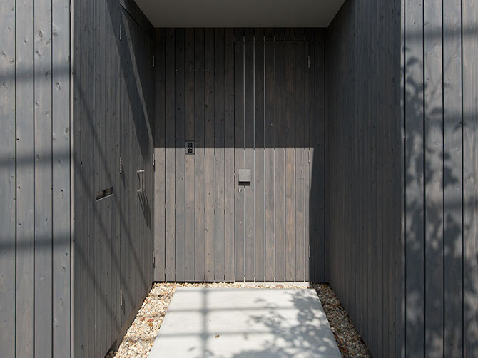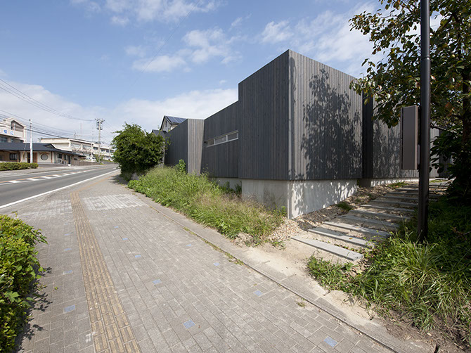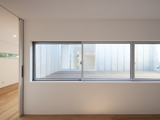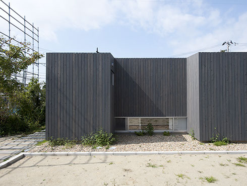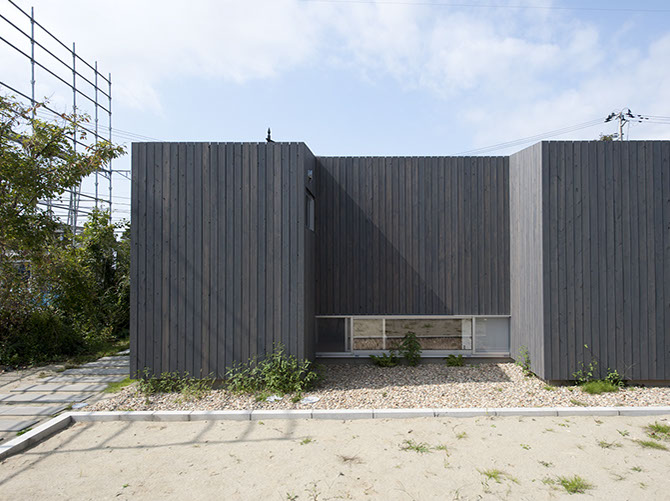 12コの外部を間に挿入した平屋の二世帯住宅。間に挟まれた外部は住人の動線や視線を繋いだり離したり、あるときは居室の延長として、またあるときは世帯間の緩衝帯として機能するように計画しました。近すぎず、でも遠すぎない「世帯間のキョリ」を模索しながら形になった住宅です。